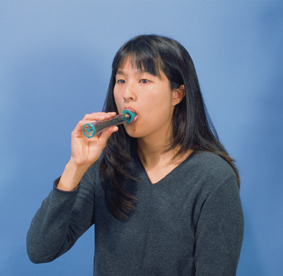 • Take a deep breath. Put the mouthpiece into your mouth and wrap your lips tightly around it. Don't block the mouthpiece with your tongue. Make sure you don't have anything in your mouth, like gum.