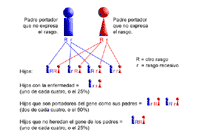 La herencia autosómica recesiva ocurre cuando el gen en cuestión se encuentra en uno de los autosomas. Estos son pares de cromosomas numerados del 1 al 22. Los autosomas no intervienen en la determinación del sexo de los hijos. "Recesivo" significa que se necesitan 2 copias defectuosas del gen para tener el rasgo o el trastorno. Un gen se hereda de la madre y el otro, del padre. Si la persona tiene solo un gen recesivo, es "portadora" del rasgo o la enfermedad, pero no presenta ningún problema de salud por ser "portadora" de una copia del gen. La mayoría de las personas no sabe que es portadora de un gen recesivo de una enfermedad hasta que tiene un hijo con la enfermedad o hay otro miembro en la familia que la tiene. Se calcula que todas las personas son portadoras de alrededor de 5 o más genes recesivos que causan enfermedades o afecciones genéticas. Una vez que los padres tienen un hijo con un rasgo o una enfermedad recesiva, la probabilidad de que, en cada embarazo siguiente, tengan otro hijo con ese mismo rasgo o trastorno es de 1 de cada 4. Esto significa que la probabilidad de que otro hijo no tenga el rasgo o la enfermedad es de 3 de cada 4.